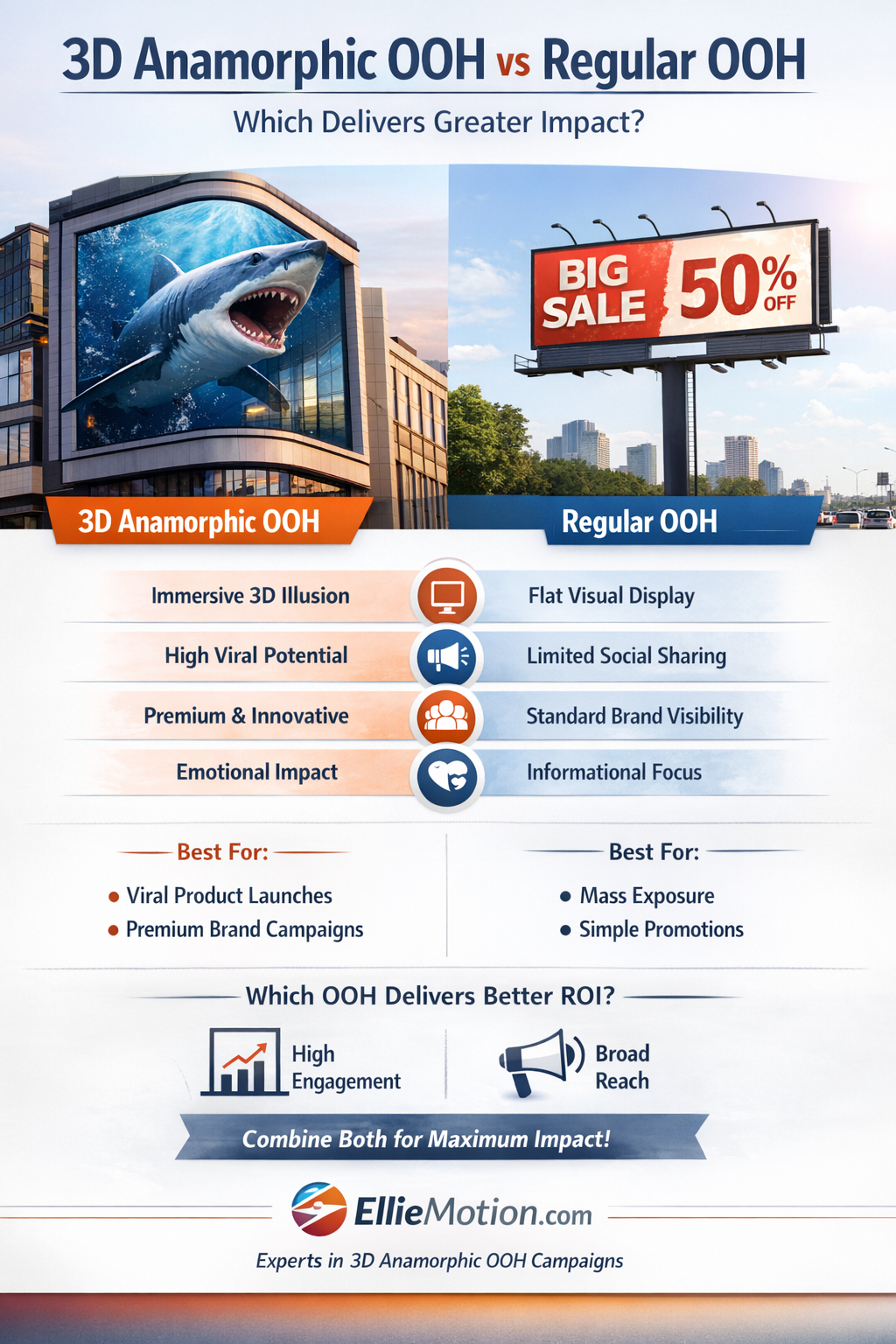 ROI depends on goals. Regular OOH offers steady exposure, while 3D anamorphic can deliver higher engagement and recall.