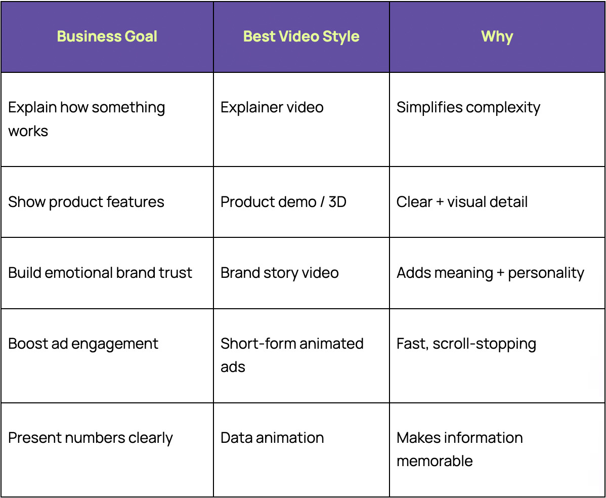 Below are the most popular (and most effective) animation styles used by brands — plus when to choose each.