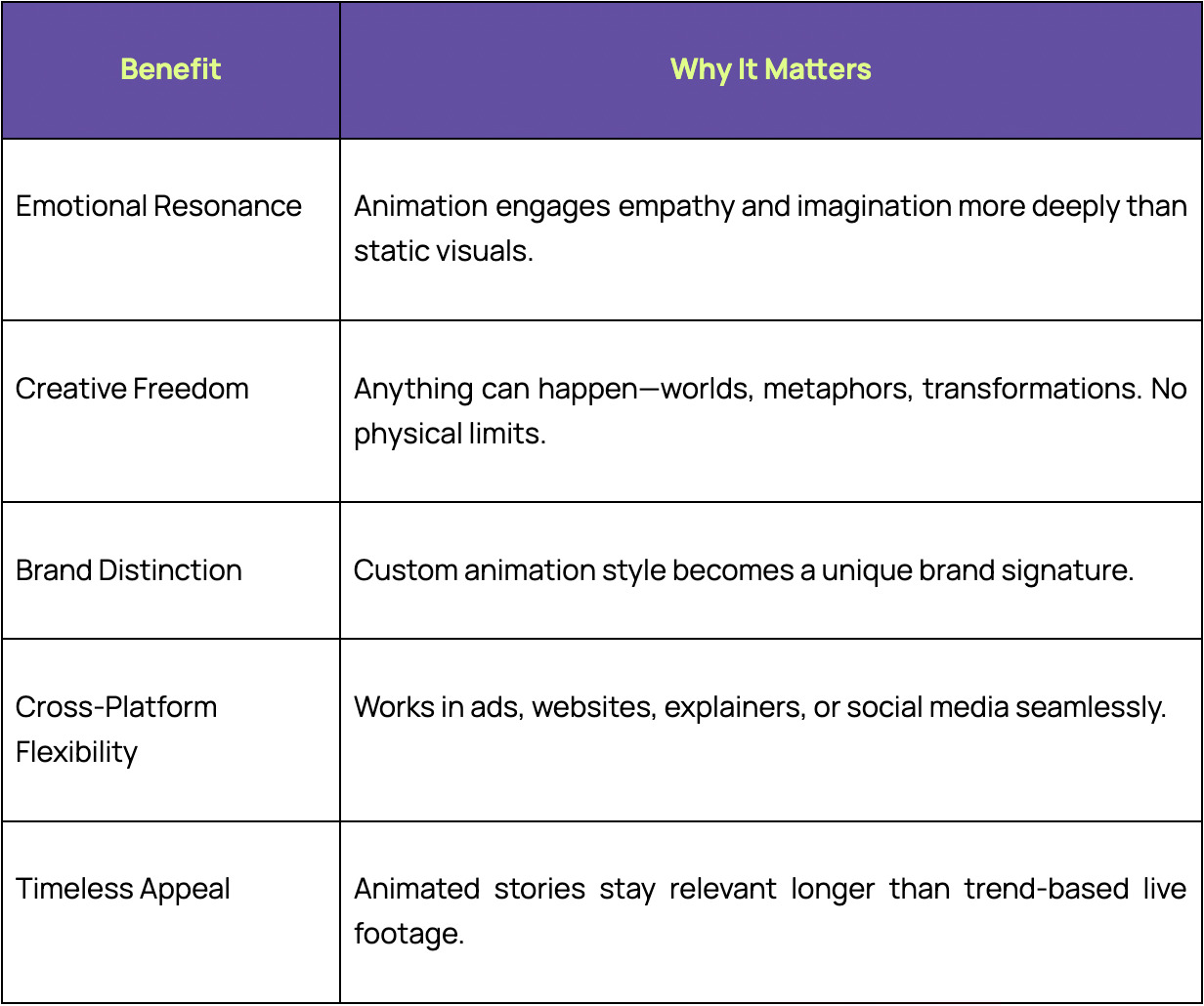 Unlike live-action videos, animation can blend fantasy and reality, making it ideal for stories that need imagination, flexibility, and emotional punch.