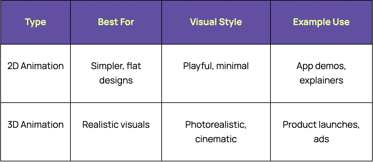 If your product relies on form, texture, or movement, 3D animation will show it best. But if your focus is ease-of-use or storytelling, 2D animation can be more efficient and cost-effective.